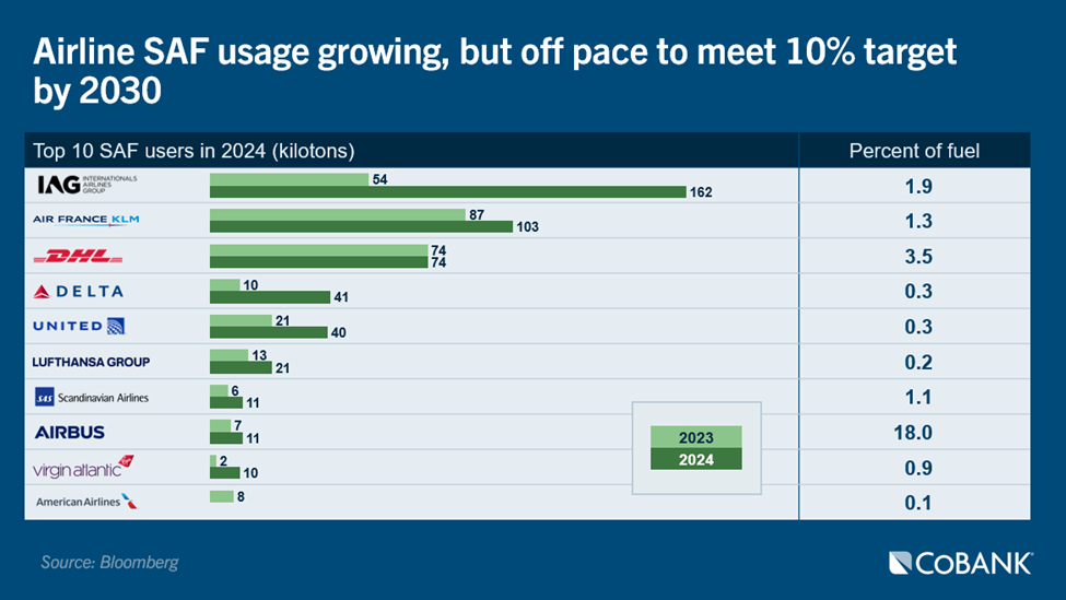 Many renewable diesel facilities in the U.S. can toggle between producing renewable diesel (RD) and SAF. The cost of producing SAF can be two to five times more than conventional diesel, creating an economic incentive to run RD rather than SAF at these plants. The economic realities with the lower tax credits exacerbate the existing mismatch between the available supply of SAF and the demand from aviation carriers. Meanwhile, very little alcohol-to-jet SAF is produced today due to higher costs.