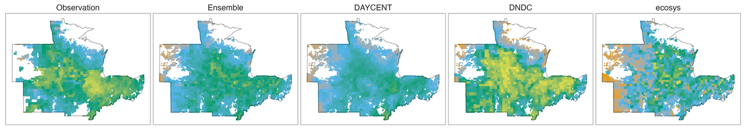 IMPROVING DATA: The three models on the right are used to predict soil carbon sequestration and GHG emissions. The DOE’s Sandia National Laboratory combined those in an “Ensemble” model, which is 50% more accurate than the three individual models when compared to field observations. The data from the RCPP project will be used to further improve modeling accuracy.